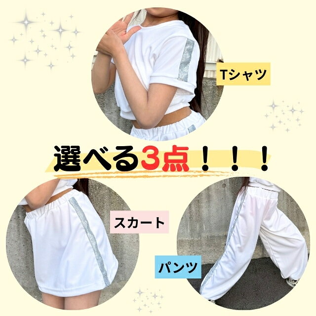 キッズ ダンス 衣装 セットアップ ヒップホップ パンツ Tシャツ スカート ラメ ライン CJPE-01[子供 キッズダンス ジュニア ガールズ レディース 大人 ダンスパンツ ダボパン 軽い 派手 よさこい 団体 黒 白 黄色 青 赤 ピンク]